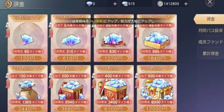 課金するのであれば12000円分のダイヤを購入することをおすすめします。