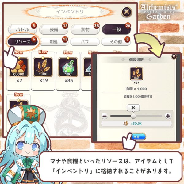 また、アイテムの中には「ブースターアイテム」というものがあり、食料や木材そしてマナ等の資源の生産量を2倍にできるアイテムもあります。