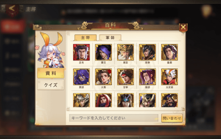 「主将」と「軍師」に分かれていて60以上のキャラクターが実装されています。