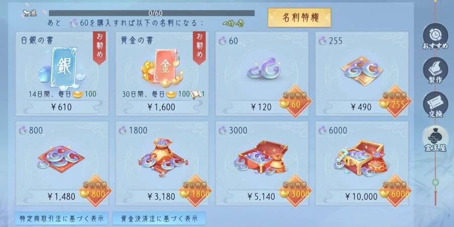 まずは黄金の書や白銀の書などのお得な商品を購入し、それで足りないようであれば、元宝と霊玉を単品購入すれば良いでしょう。