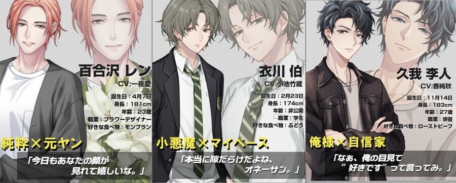 職業が俳優のさわやかイケメンの久我李人(声優:香純秋)、元ヤンキーだったが今は花屋で働いている癒やし系イケメン百合沢レン(声優:一夜愛)など、個性豊かなカレが数多く登場します。