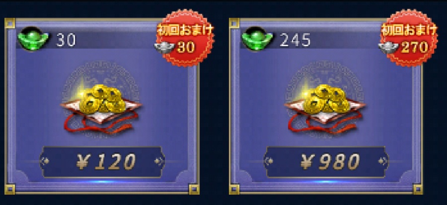 三国群英伝Mは、最小課金額の120円で元宝30個(1個あたり4円)、最大課金額の10,000円で元宝2,500個(1個あたり4円)を入手可能。
