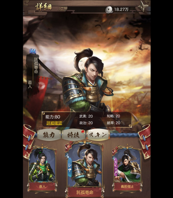 家来の武将には5つ程度のスキンが用意されています。