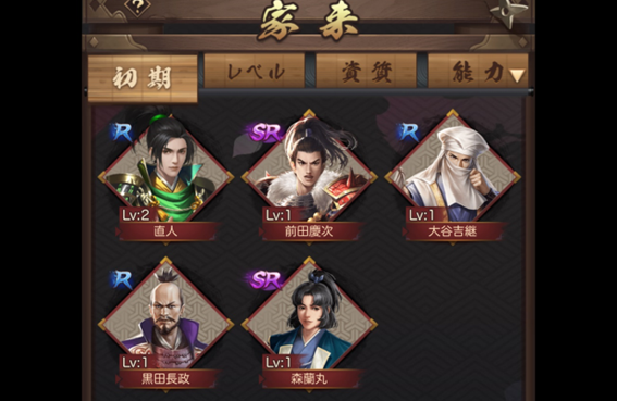 戦国の野望~黄金の日々では、武将は低い順からR・SR・SSRに分類されています。